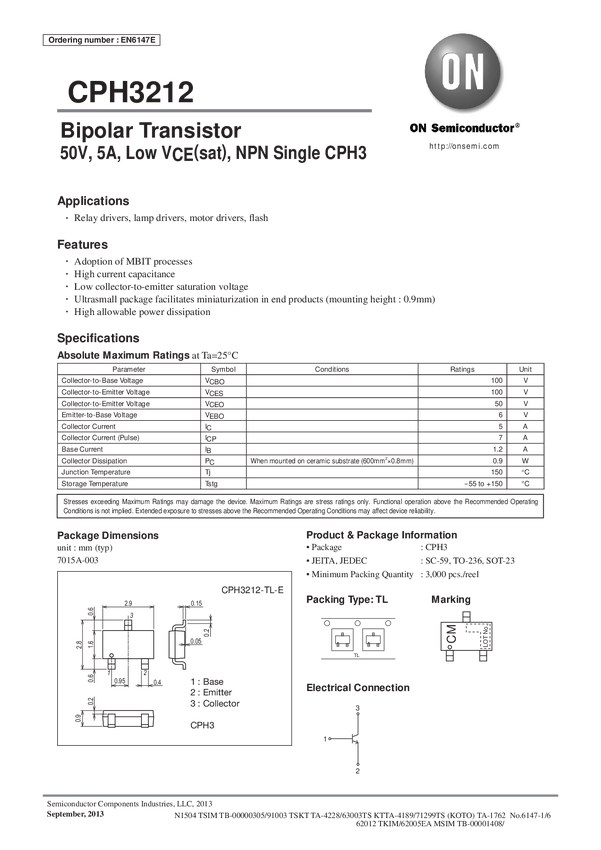 CPH3212 Bipolar Transistor, 50V, 5A, Low VCE(sat), NPN Single CPH3
