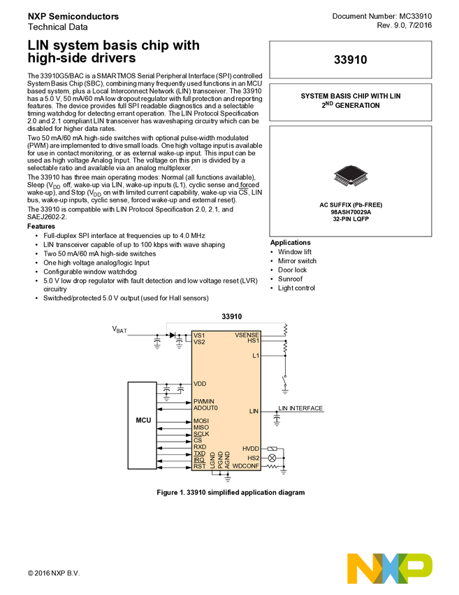 MC33910BAC System Basis Chip, LIN, 1x 5.0V/60mA LDOs, High-Side Drivers, QFP 32