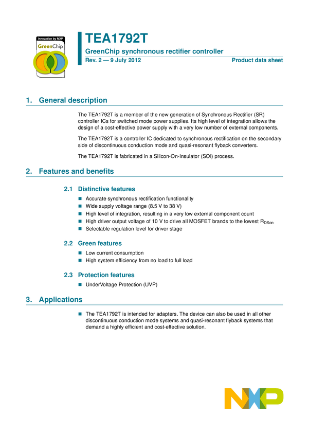 TEA1792T Synchronous rectification controller suitable for both high-side and low-si...