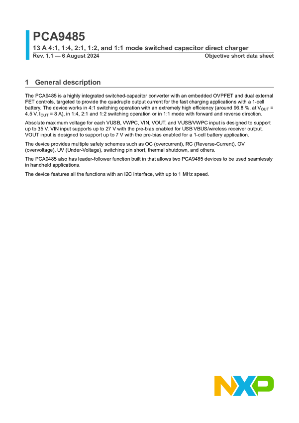 PCA9485UK 13 A, 4:1, 1:4, 2:1, 1:2 and 1:1 mode switched capacitor direct charger