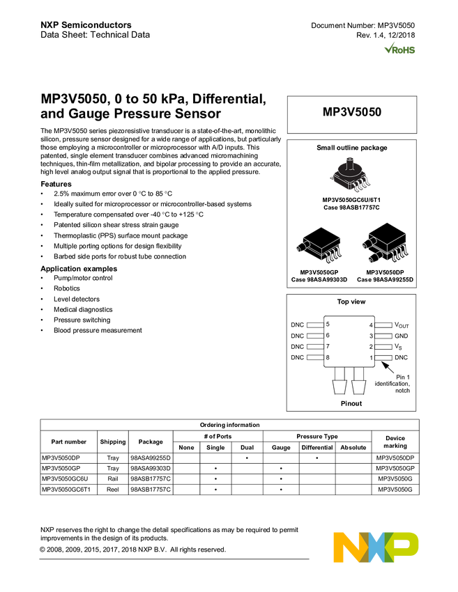 MP3V5050GC6 Pressure Sensor, 3V, 0/50kPa, SOP 8, Axial Port