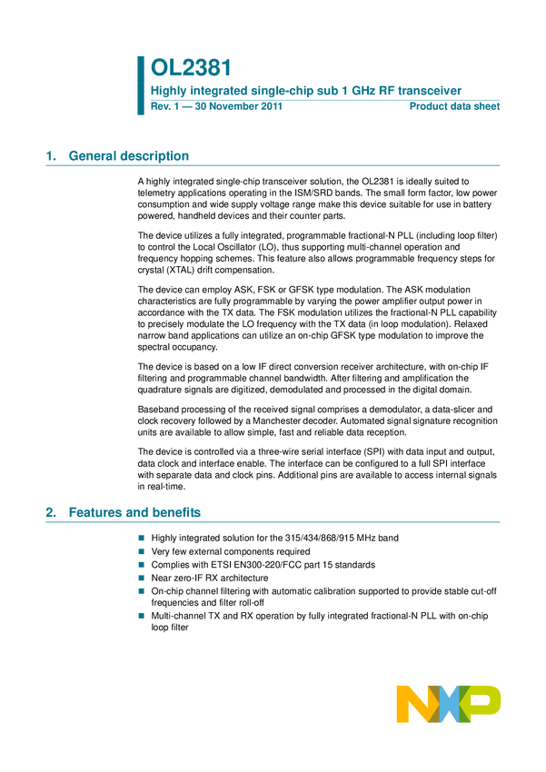 OL2381AHN Highly integrated single-chip sub 1 GHz RF transceiver