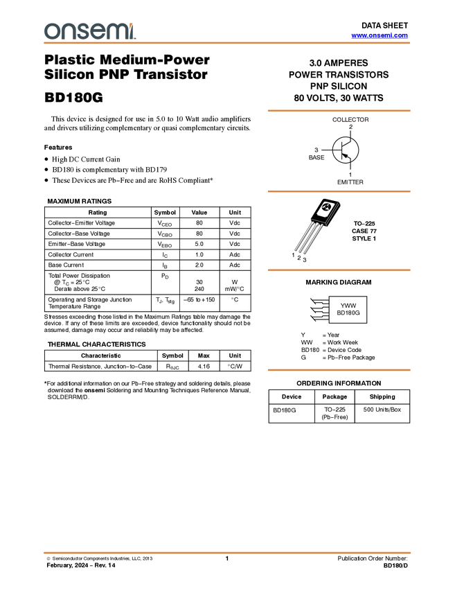 BD180 1.0 A, 80 V PNP Bipolar Power Transistor