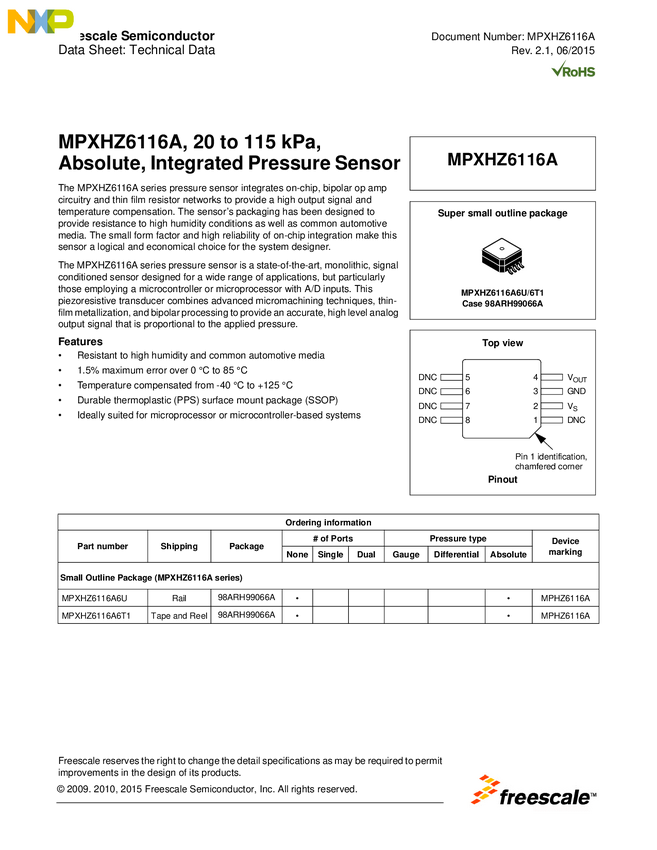 MPXHZ6116A6U Pressure Sensor, 5V, 20/115kPa, SOP 8