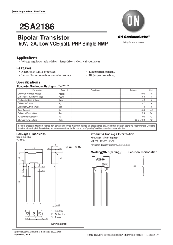 2SA2186 Bipolar Transistor, -50V, -2A, Low VCE(sat), PNP Single NMP