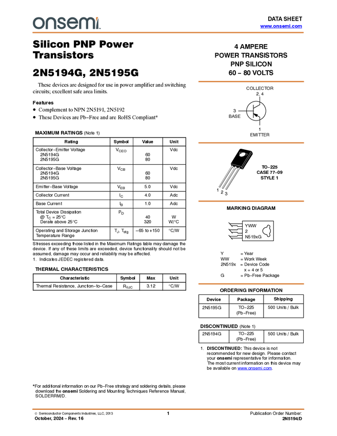 2N5195 4.0 A, 80 V PNP Bipolar Power Transistor