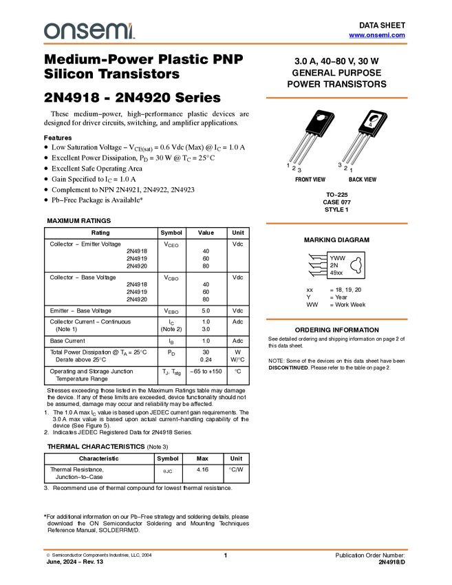 2N4918 1.0 A, 80 V PNP Bipolar Power Transistor