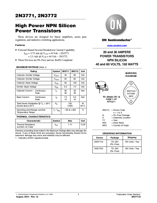 2N3772 20 A, 60 V NPN Bipolar Power Transistor