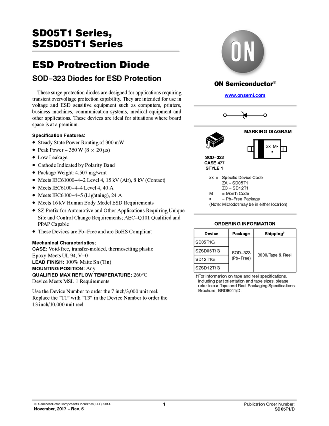 SD05 ESD Protection Diode, Unidirectional, SOD-323