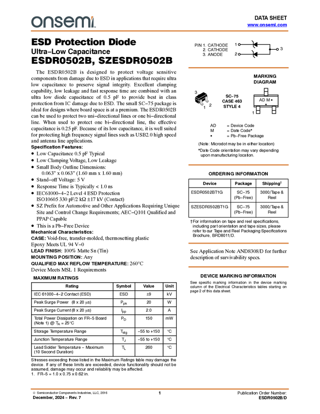 ESDR0502B ESD Protection Diode, Low Leakage, Fast Response Time, with Clamping Capabi...