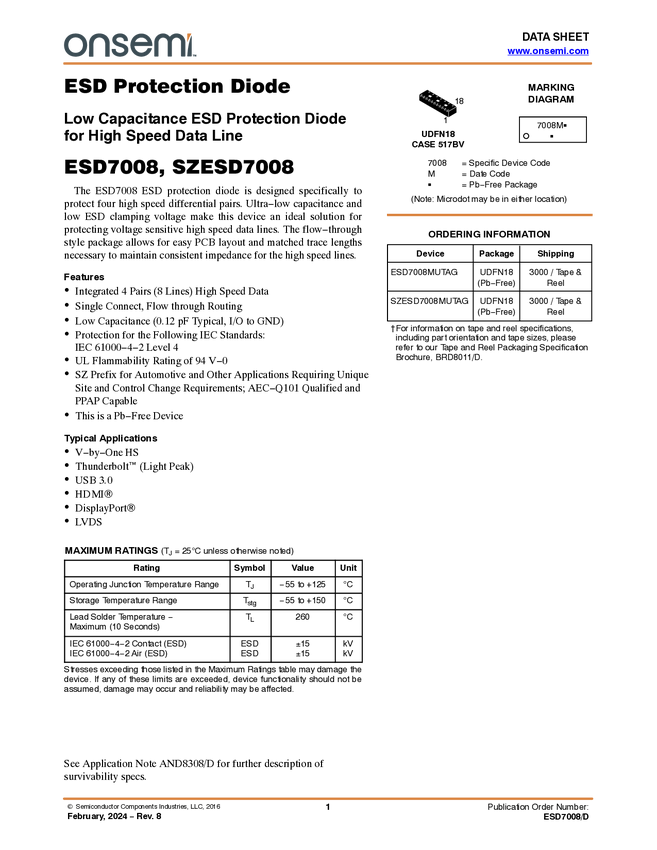 ESD7008 ESD Protection Diode, High Speed Data, Low Capacitance