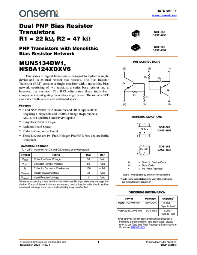 NSBA124XDXV6 50V Dual PNP Bipolar Digital Transistor