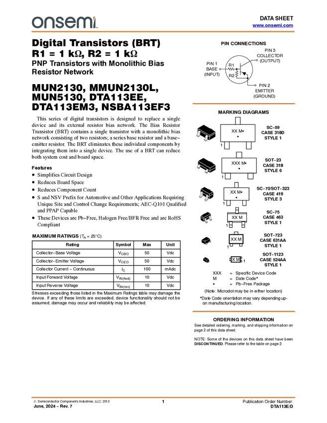 NSBA113EF3, MUN5130, MUN2130, MMUN2130L, DTA113EE