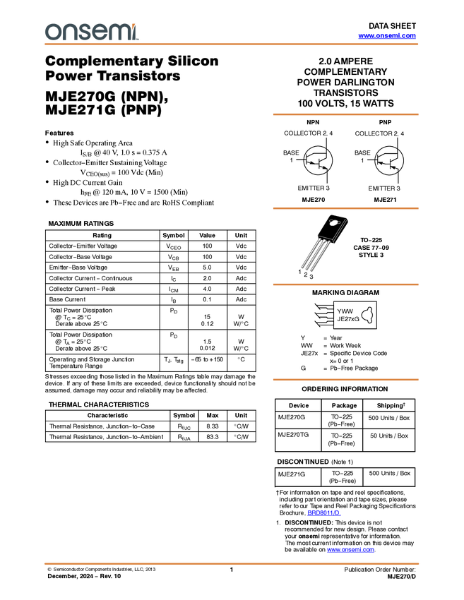 MJE270 2.0 A, 100 V PNP Darlington Bipolar Power Transistor