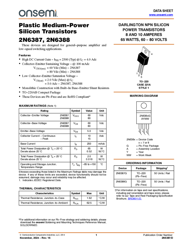 2N6388 10 A, 80 V NPN Darlington Bipolar Power Transistor