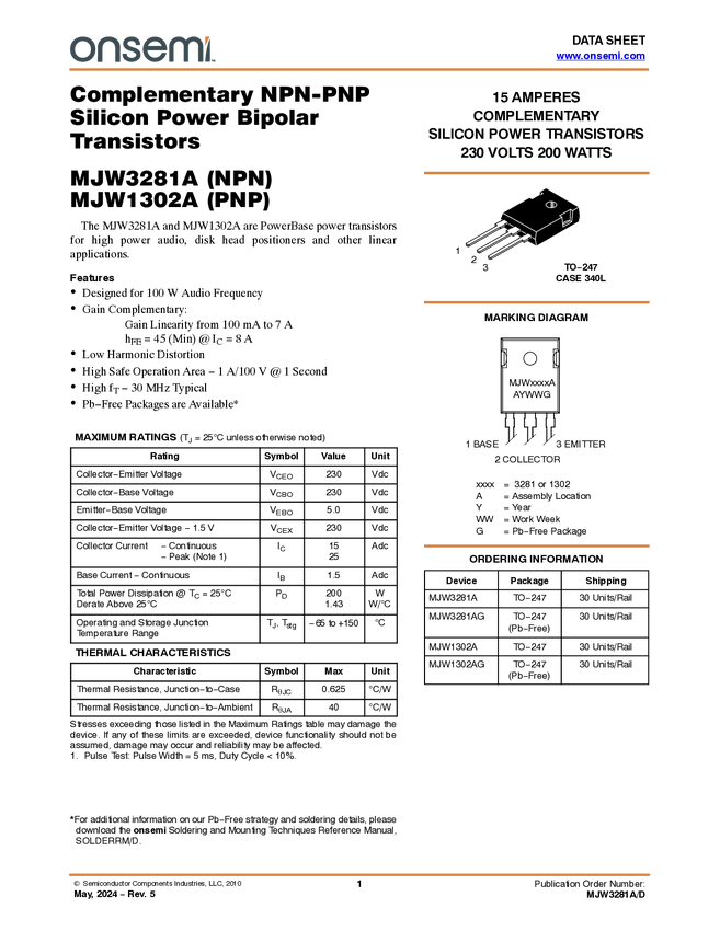 MJW1302A 15 A, 230 V, 200 Watt, NPN Bipolar Power Junction Transistor