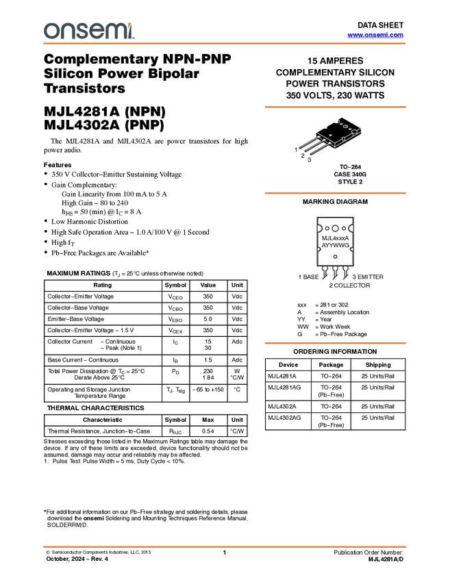 MJL4302A Bipolar Power Transistor, PNP, 15 A, 350 V, 230 Watt