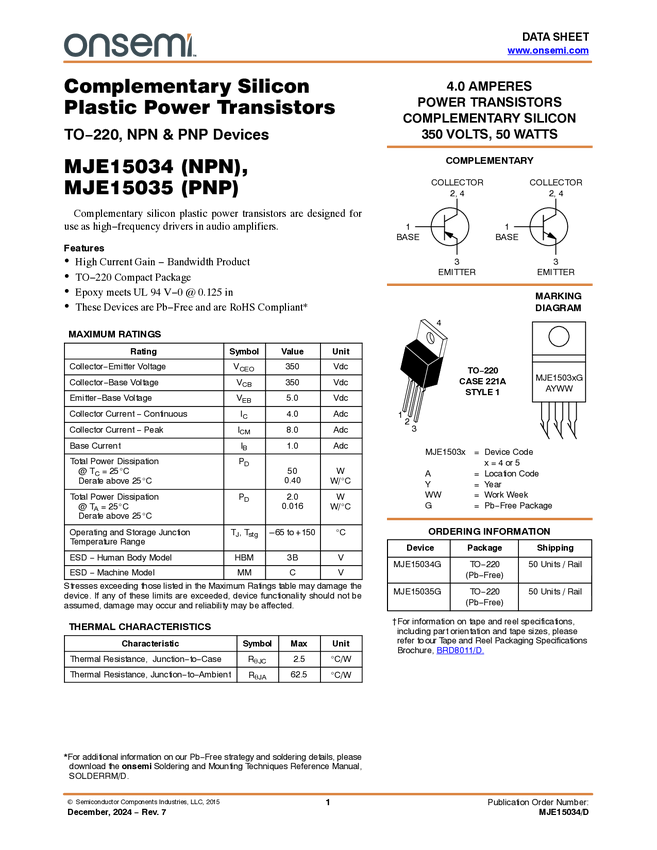 MJE15034 Bipolar Transistor, PNP, 350 V, 4.0 A