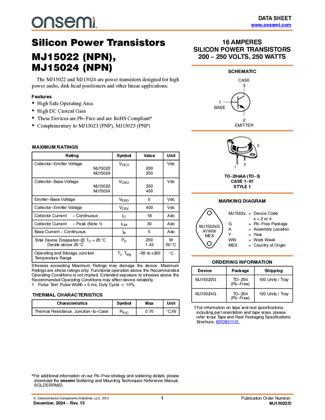 MJ15022 Bipolar Transistor, NPN, 250 V, 16 A