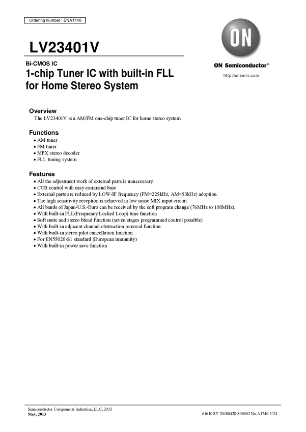 LV23401V 1-chip Tuner IC incorporating FLL for Home Stereo System