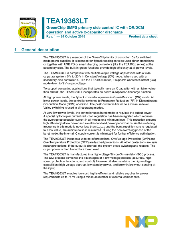 TEA19363LT GreenChip SMPS primary side control IC with QR/DCM operation and active x-c...