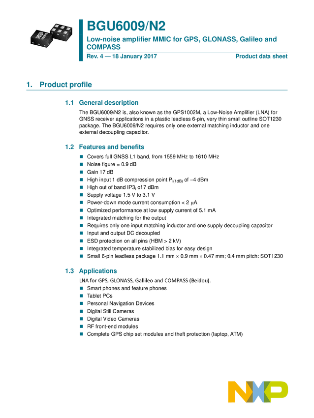 BGU6009 Low Noise Amplifier MMIC for GPS, GLONASS, Galileo and Compass