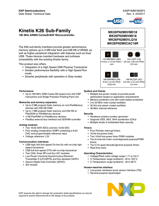 Kinetis<sup>®</sup> K26-180 MHz, Dual High-Speed and Full-Speed USBs, 2MB Flash Microcontrollers (MCUs) based on Arm<sup>®</sup> Cortex<sup>®</sup>-M4 Core
