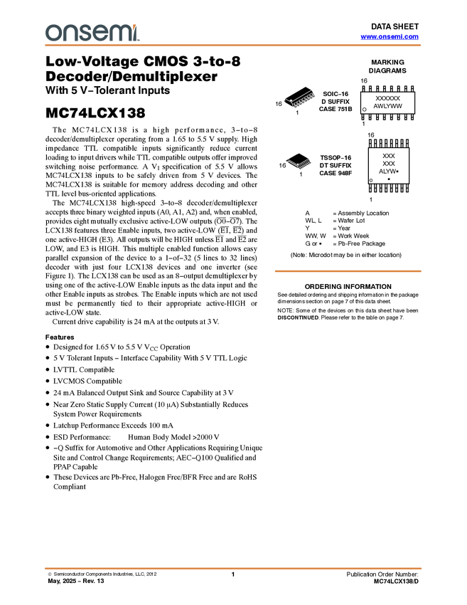 MC74LCX138 Low Voltage CMOS 3-to-8 Decoder/Demultiplexer