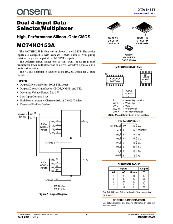 MC74HC153A Dual 4-Input Data Selector/Multiplexer High-Performance Silicon-Gate CMOS