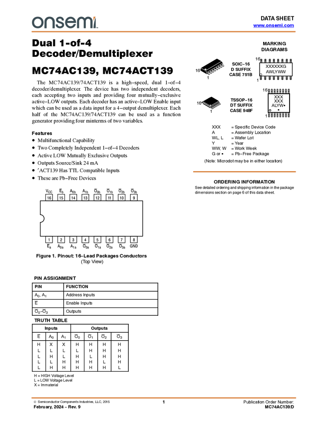 MC74AC139 Dual 1-of-4 Decoder/Demultiplexer