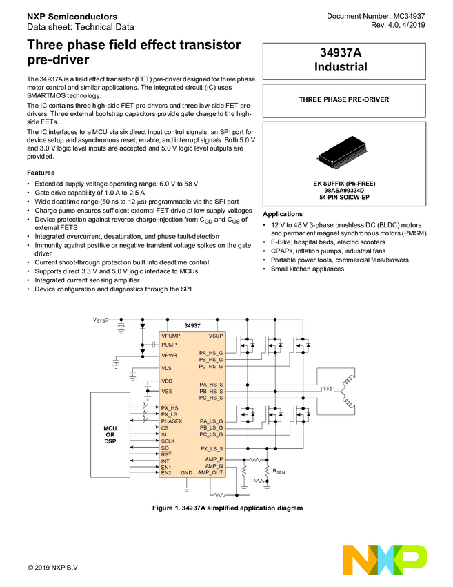MC34937APEK Motor driver, 3 Phase FET pre-driver, >1.5A gate drive, FET protection, 58V...