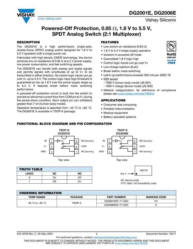 DG2001E Powered-Off Protection, 0.85 Ω, 1.8 V to 5.5 V, SPDT Analog Switch (2:...