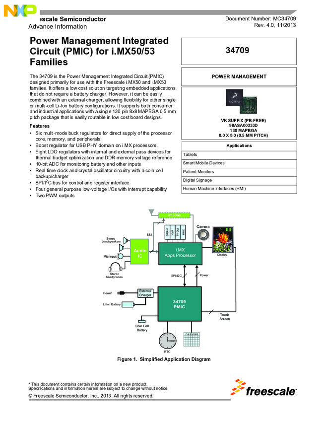 MC34709VK Power Management IC, i.MX50/53, 10 Bit ADC, 6 buck, 8 LDO, MAPBGA 130