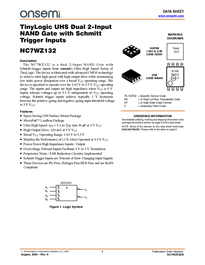 NC7WZ132 TinyLogic UHS Dual 2-Input NAND Gate with Schmitt Trigger Inputs