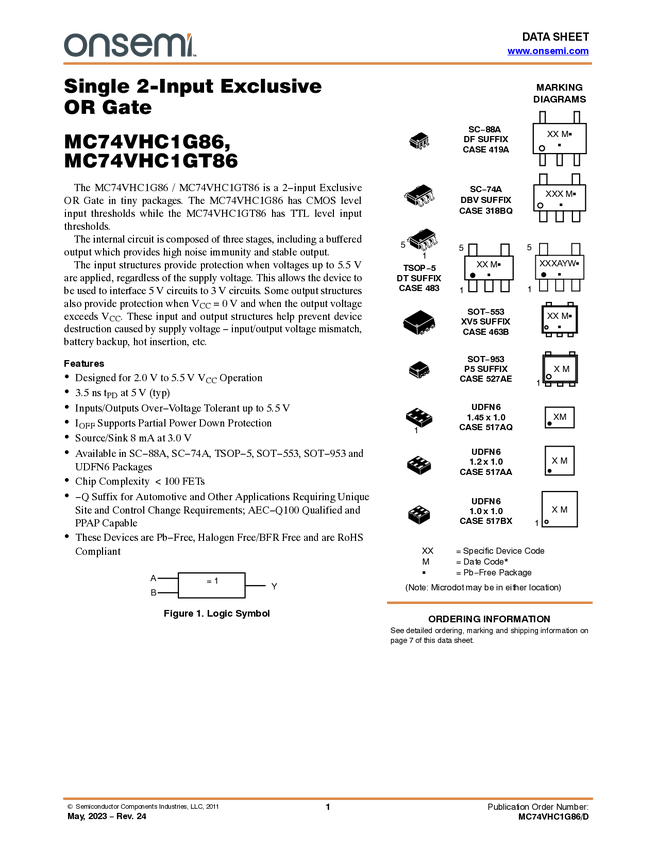 MC74VHC1G86 Single 2-Input Exclusive OR Gate, TTL Level