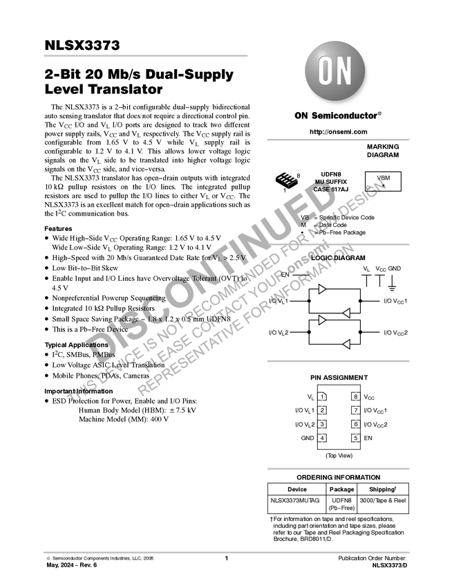 NLSX3373 Translator, Dual-Supply Level, 2-Bit, 20 Mb/s