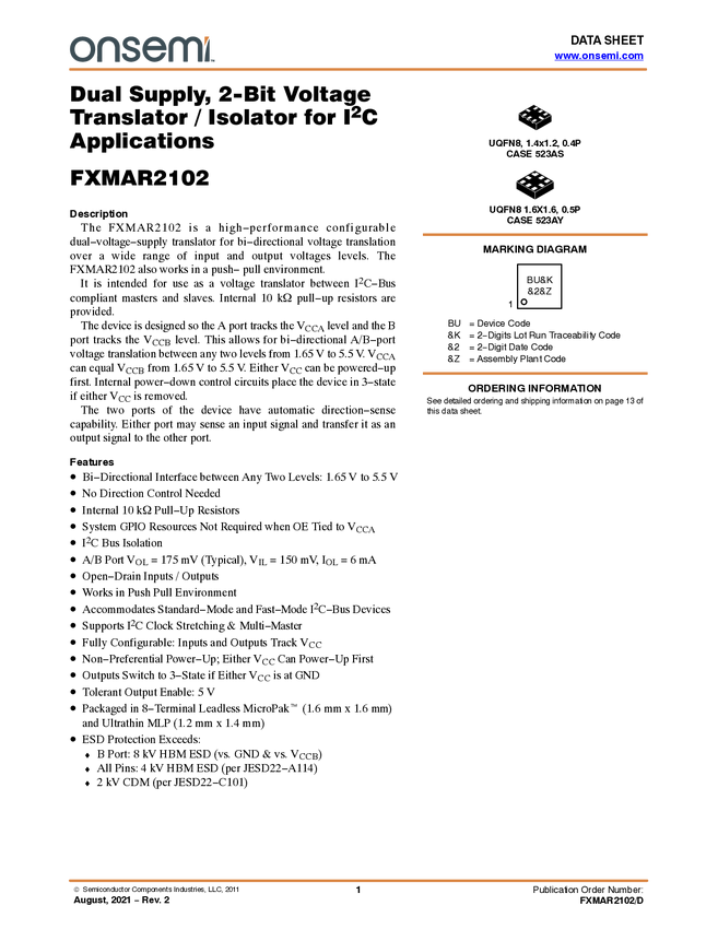 FXMAR2102 Dual Supply 2-Bit Voltage Translator/ Isolator for I2C Applications