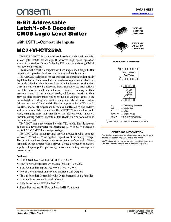 MC74VHCT259A 8-Bit Addressable Latch/1-of-8 Decoder CMOS Logic Level Shifter