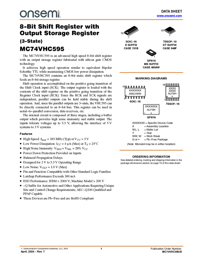 MC74VHC595 8-Bit Shift Register w/Output Storage Register (3-State)