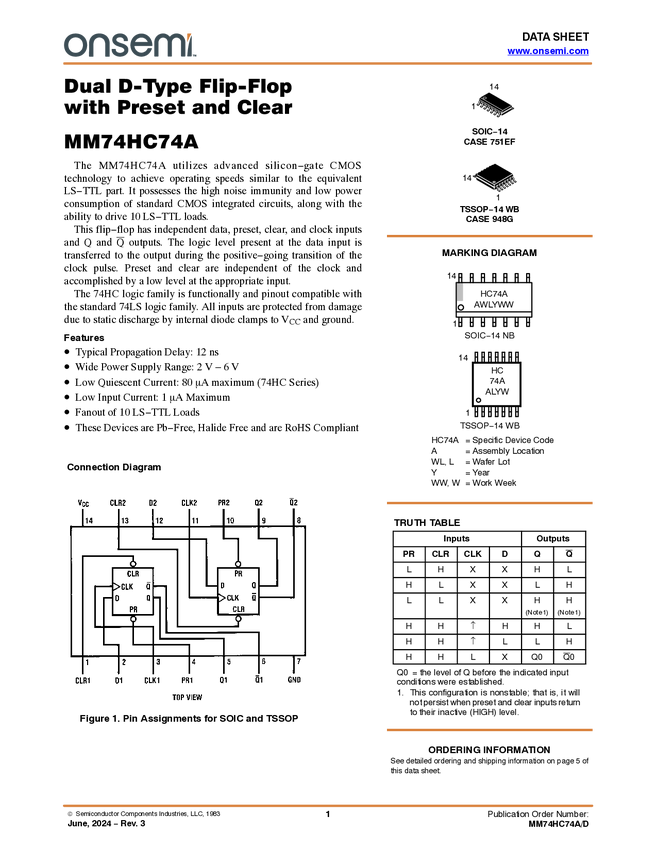 MM74HC74A Dual D-Type Flip-Flop with Preset and Clear