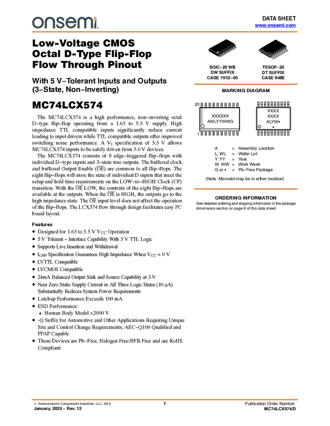 MC74LCX574 Low Voltage CMOS Octal D Flip-Flop Flow Through Pinout