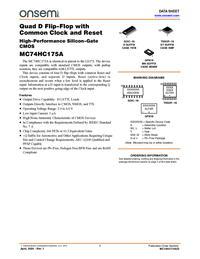 MC74HC175A Quad D Flip-Flop with Common Clock and Reset