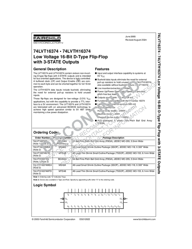 74LVT16374 Low Voltage 16-Bit D Flip-Flop with 3-STATE Outputs