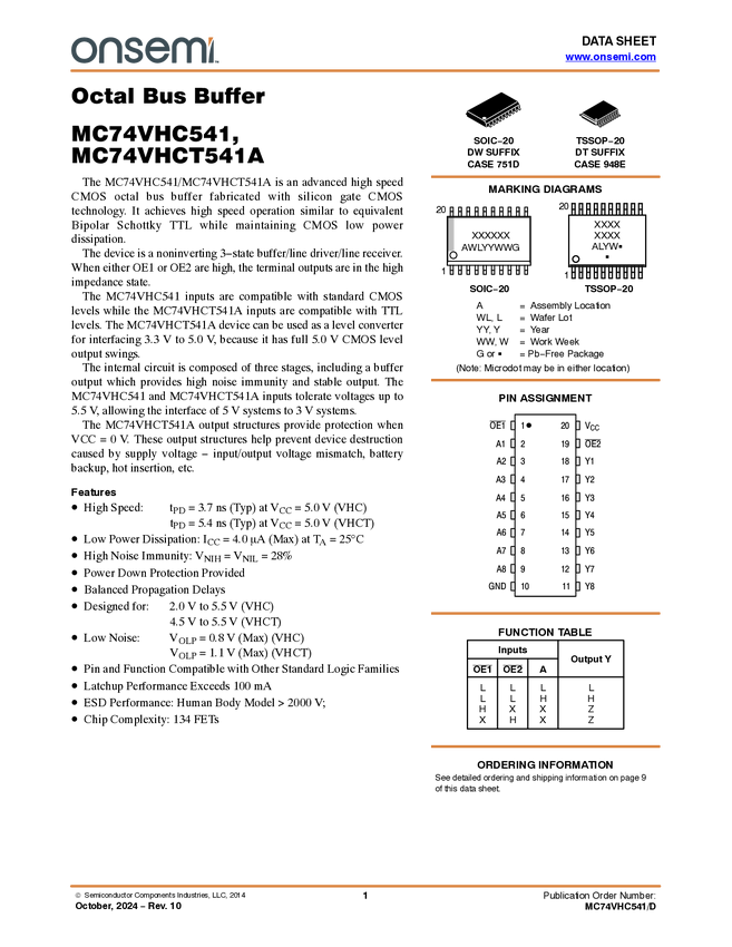 MC74VHCT541A Non-inverting Octal Bus Buffer/Line Driver/Line Receiver, TTL Level, 3-Stat...