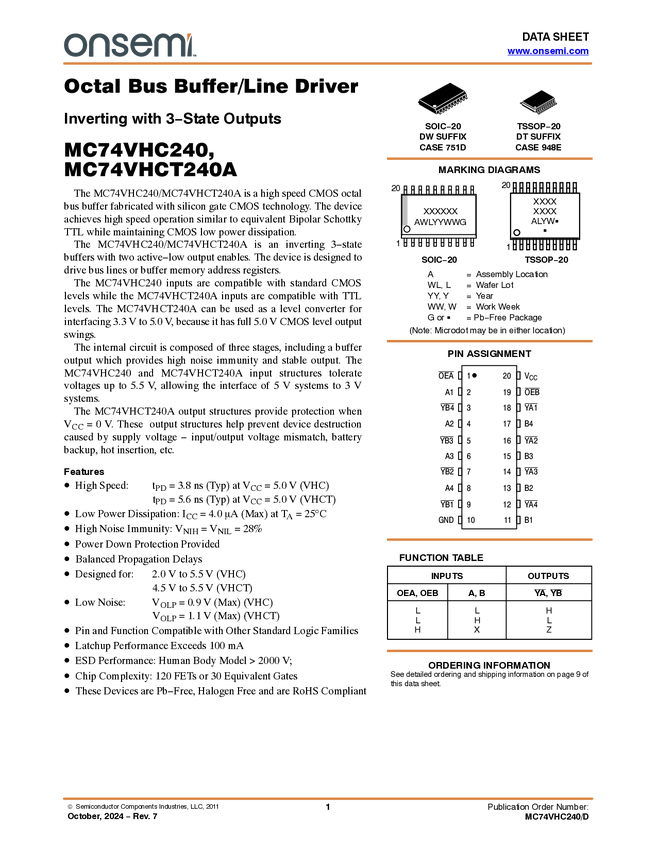 MC74VHCT240A Octal Inverting Buffer/Line Driver, 3-State Output