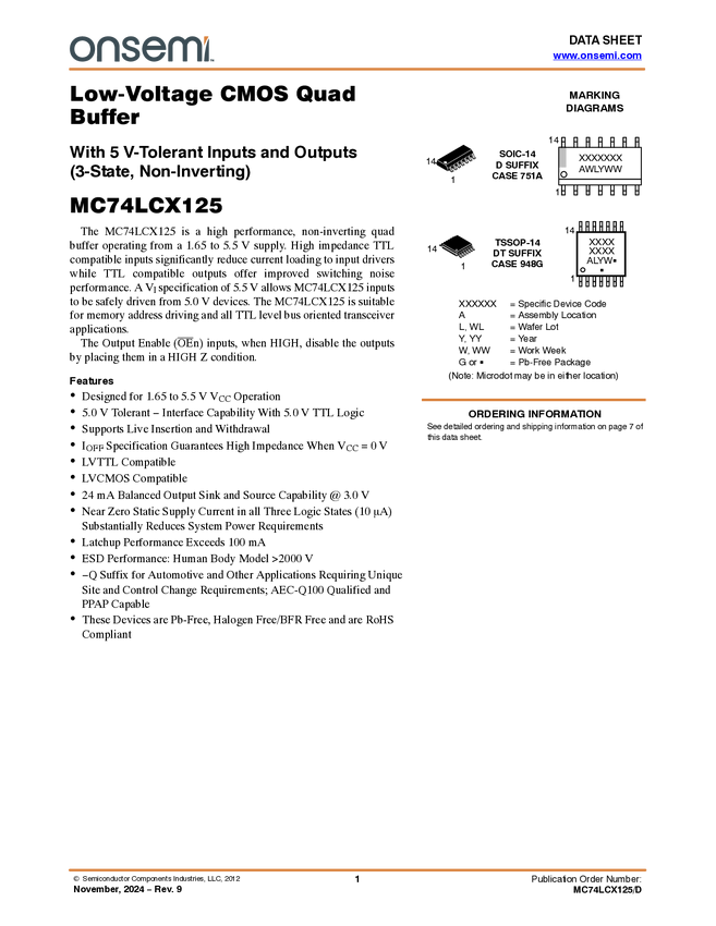 MC74LCX125 Low Voltage Quad Non-Inverting Buffer, 3-State