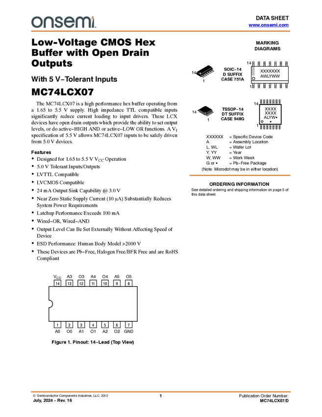 MC74LCX07 Low Voltage CMOS Hex Buffer with Open Drain Outputs and 5V-Tolerant Inputs