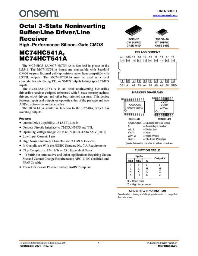 MC74HCT541A Octal 3-State Non-inverting Buffer/Line Driver/Line Receiver, TTL Level