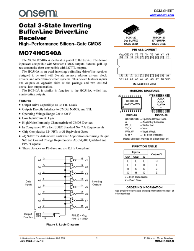 MC74HC540A Octal 3-State Inverting Buffer/Line Driver/Line Receiver