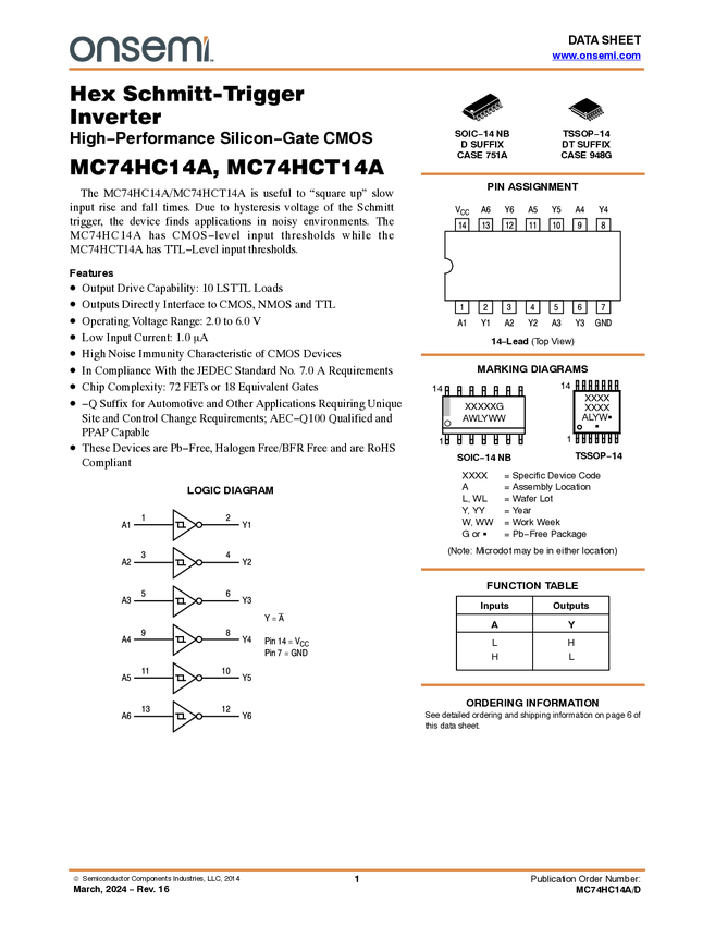 MC74HC14A Hex Inverter with Schmitt Trigger Input